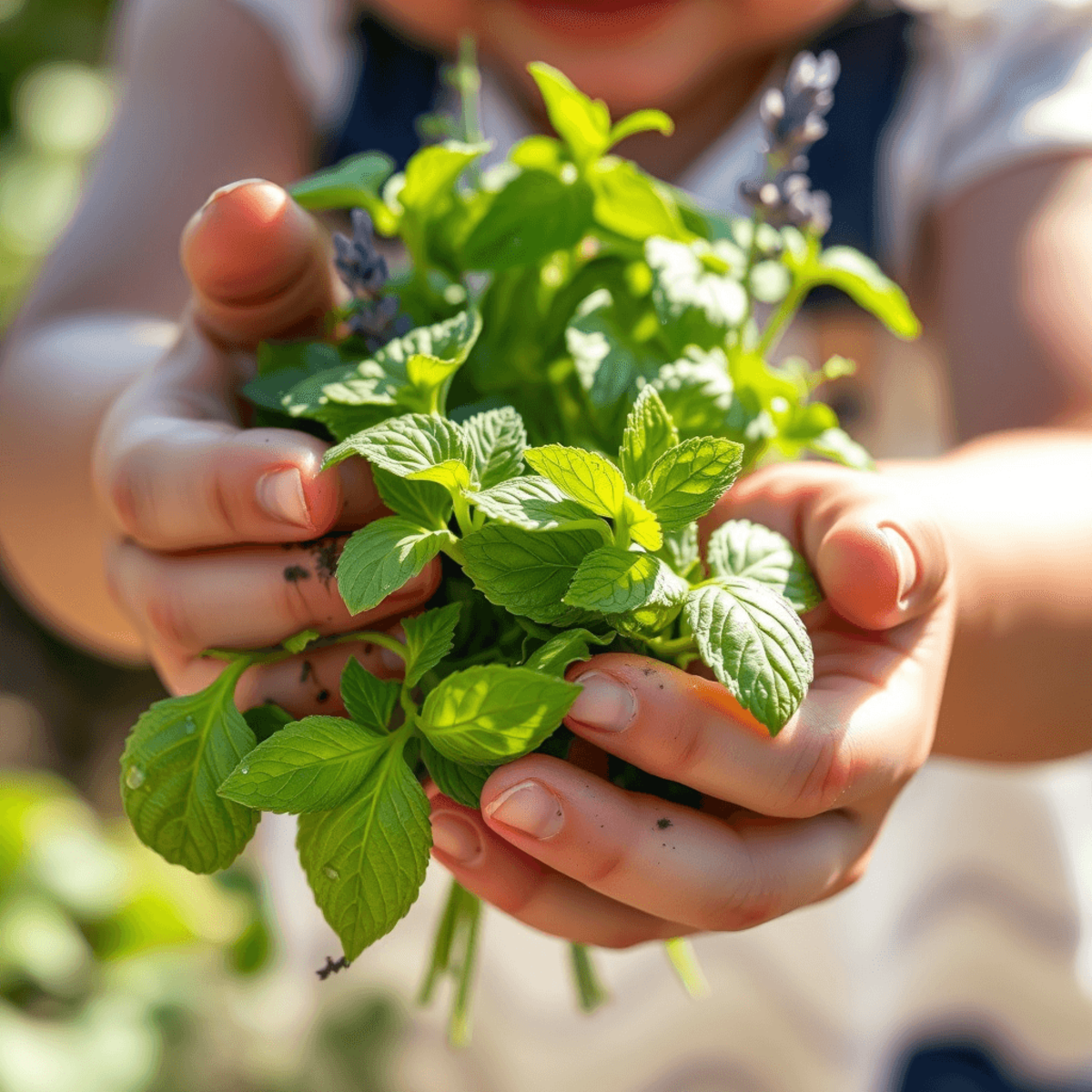 Самый простой вариант — игра «Угадай травку». Соберите несколько разных ароматных растений: мяту, мелиссу, укроп, базилик, душицу, листья смородины или томата. Дайте ребенку понюхать каждое, назовите его, обсудите ощущения: «Мята холодная и свежая, а базилик пряный и теплый». Затем попросите его закрыть глаза и угадать растение только по запаху. Постепенно можно усложнять задачу, добавляя больше видов или предлагая найти знакомый аромат среди нескольких.